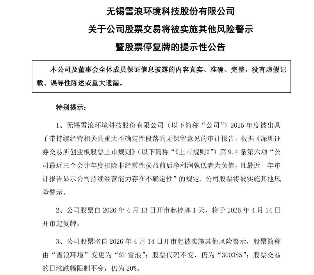 4月10日晚间,雪浪环境(证券代码:300385)发布公告称,因公司最近三个会计年度扣非前后净利润孰低者均为负值,且2025年度审计报告被出具带持续经营重大不确定性段落的无保留意见,触及深交所《创业板上市规则》相关规定,公司股票交易将被实施其他风险警示。