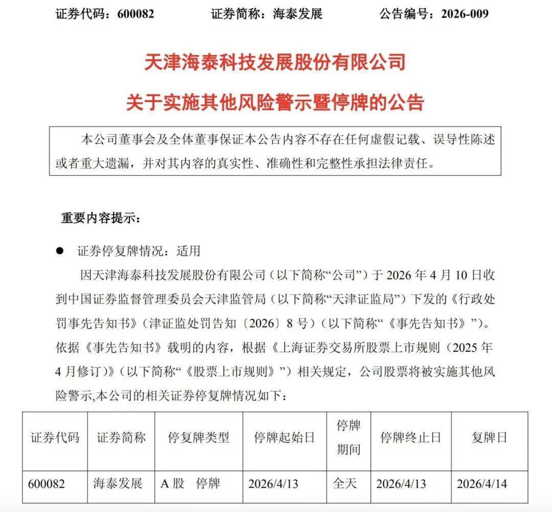 海泰发展(600082)4月10日发布公告称,公司收到天津证监局《行政处罚事先告知书》,因2021年至2022年年度报告存在虚假记载,公司股票将被实施其他风险警示,股票简称将变更为“ST海泰”,股票将于4月13日停牌一天,4月14日起正式实施其他风险警示。