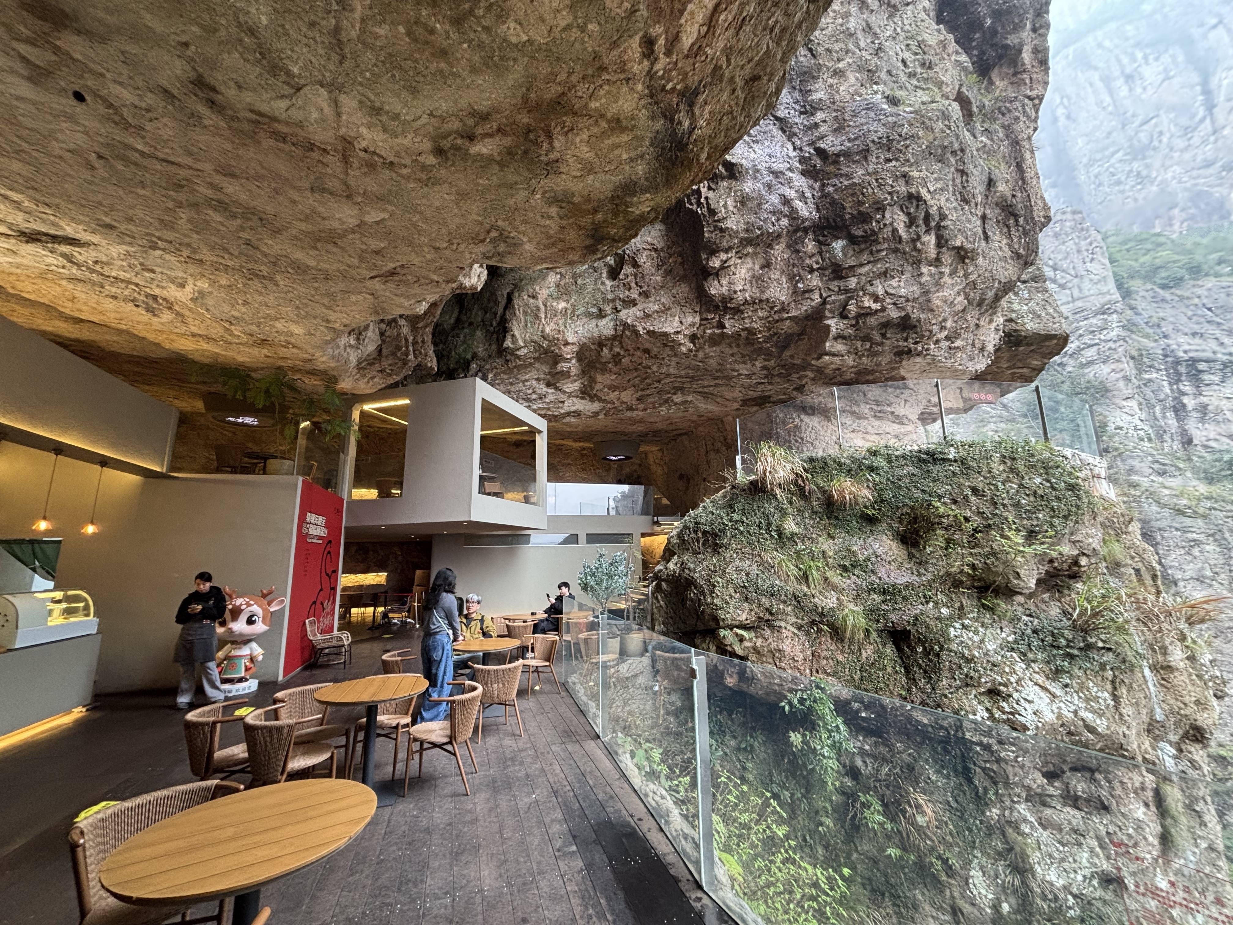 这是雁荡山上一处由洞穴改造的咖啡店。新华社记者余春生 摄“很难想象悬崖之上还藏着这样一处休闲空间。”前来游玩的游客陈欣浩告诉记者,当地把景区风光和新业态结合得恰到好处,十分吸引人。